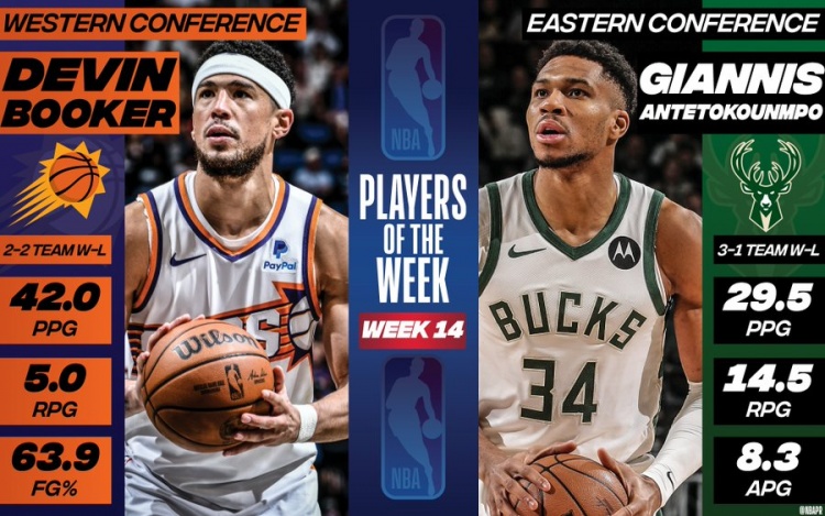 1月30日讯 NBA官方今日公布了上周东西部周最佳球员得主,太阳球星布克和雄鹿球星字母哥分别当选。