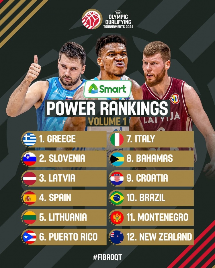 其中,字母哥领衔的希腊高居榜首,东契奇率领的斯洛文尼亚紧随其后,拉脱维亚第3,西班牙第4。第5-12名分别为: