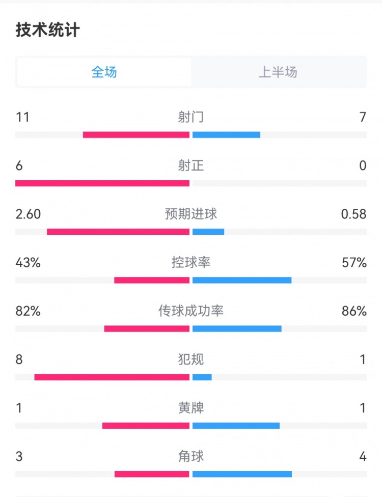 12月29日讯 本轮英超,布莱顿主场2-0半场领先热刺。双方数据对比如下↓(布莱顿在前)