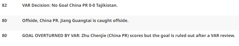 亚足联官网的实时描述写道:“朱辰杰的进球被VAR推翻,中国队蒋光太被认定越位。比分仍是0-0。”