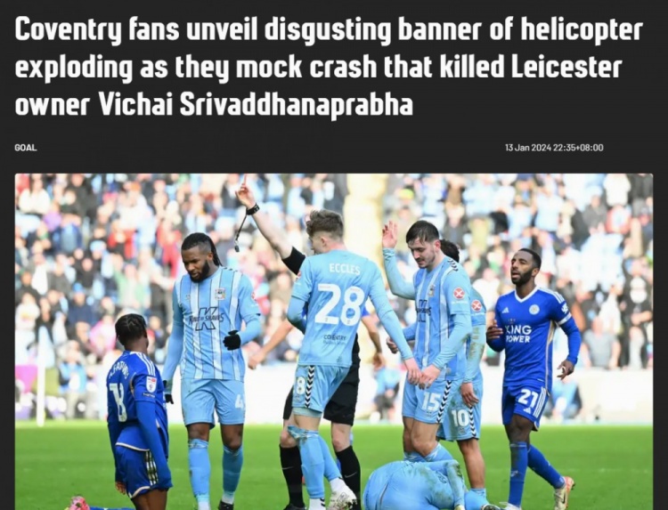 部分考文垂球迷悬挂横幅,嘲讽因直升飞机事故不幸遇难的莱斯特城前老板维猜等五人,当地警方没收了这些横幅。