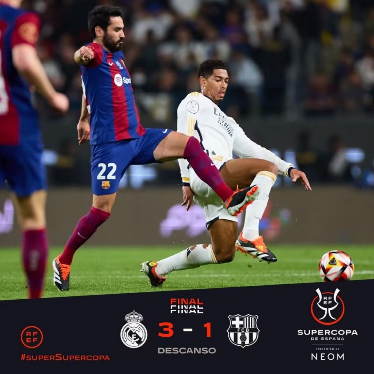 1月15日讯 西超杯决赛决赛,皇马对阵巴萨。上半场皇马梦幻开局,维尼修斯3分钟2球,贝林厄姆、罗德里戈送助攻,费兰远射中框,莱万凌空爆射破门扳回一城,阿劳霍送点,维尼修斯点射命中半场戴帽。半场战罢,皇马3-1巴萨。