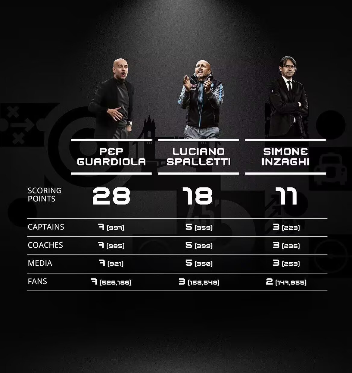 01月16日讯 瓜迪奥拉当选FIFA2023年年度最佳主帅,具体的得票详情也已经出炉,瓜迪奥拉全面领先,细节如下。