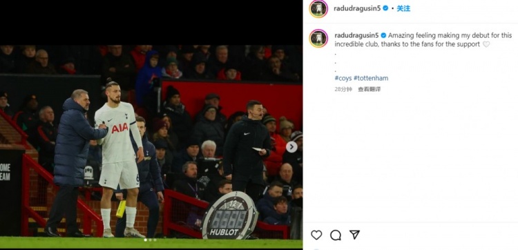 本场比赛过后,上演热刺首秀的德拉古辛更新了社媒动态:“为这支不可思议的俱乐部首秀感觉很棒,感谢球迷们的支持??”。