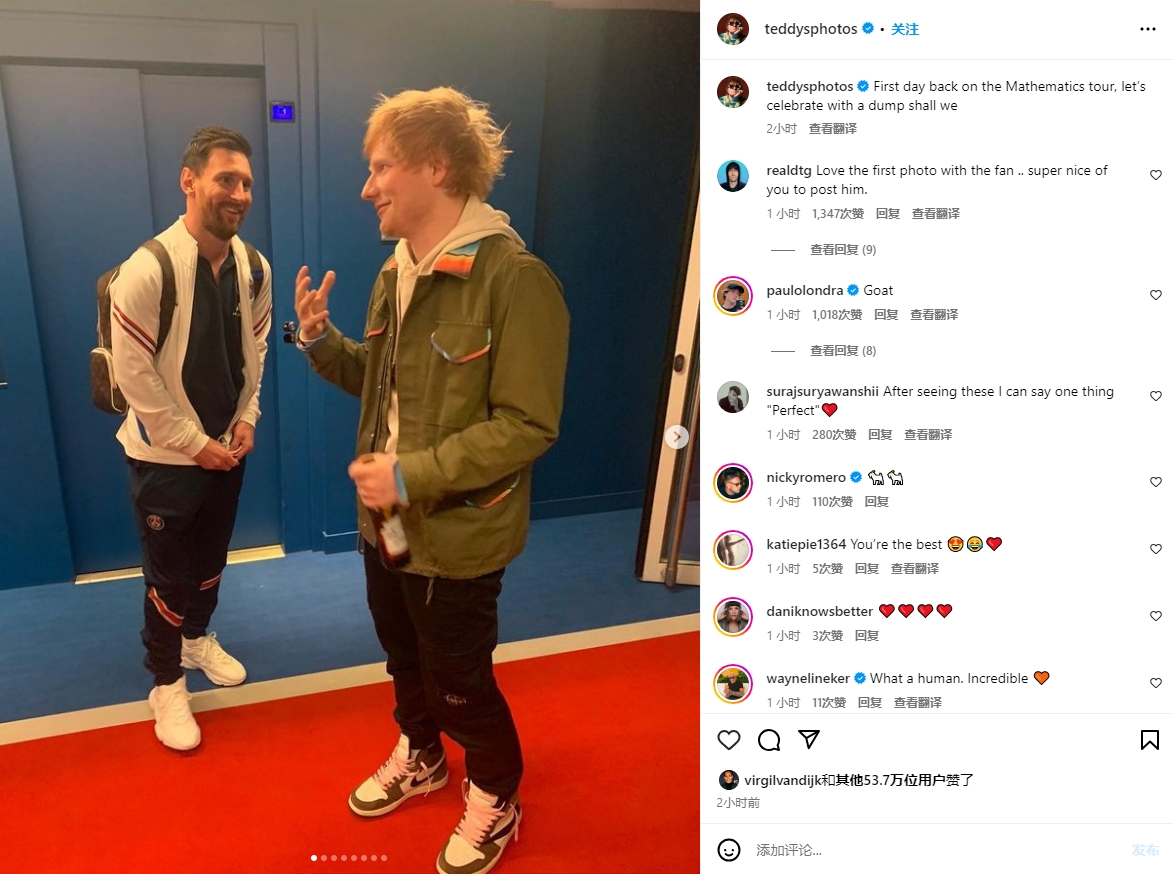 黄老板这则动态有8张照片,他使用了和梅西的同框照当做第一张的封面图,他表示道:回到Mathematics tour的第一天,让我们来庆祝一下,好吗。