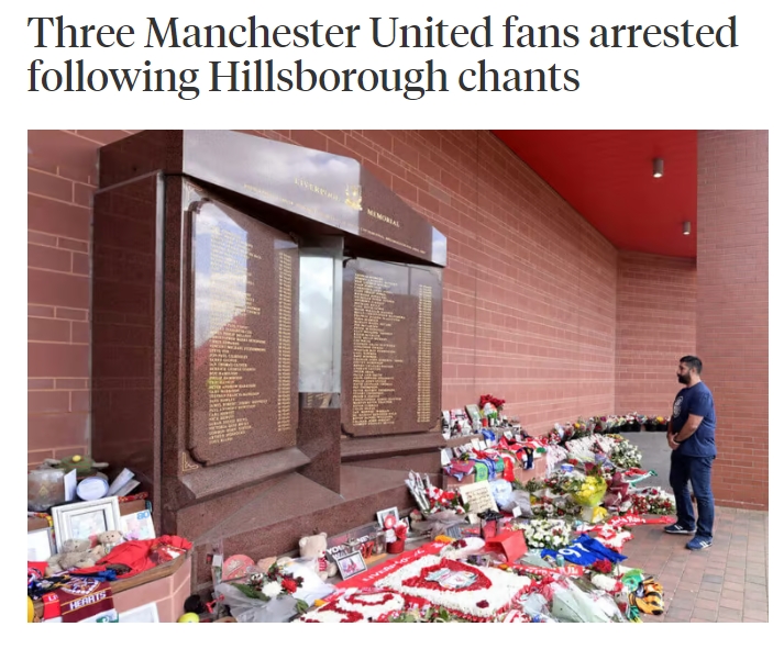 1月17日讯 据The Athletic报道,有三名曼联球迷因高喊有关希尔斯堡惨案相关的口号而被警方逮捕。