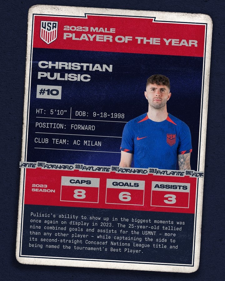 普利西奇现年25岁,这位攻击手2023年为美国队出战8次,贡献6球3助攻,他最终击败巴洛贡、穆萨、佩皮和特纳,当选美国男足年度最佳球员。