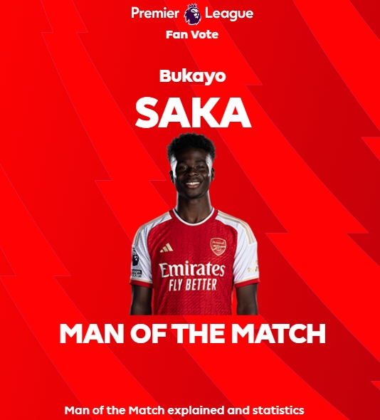 在英超官方赛后发起的本场最佳投票中,萨卡以58.2%的得票率当选,排在次席的是热苏斯的23.1%。