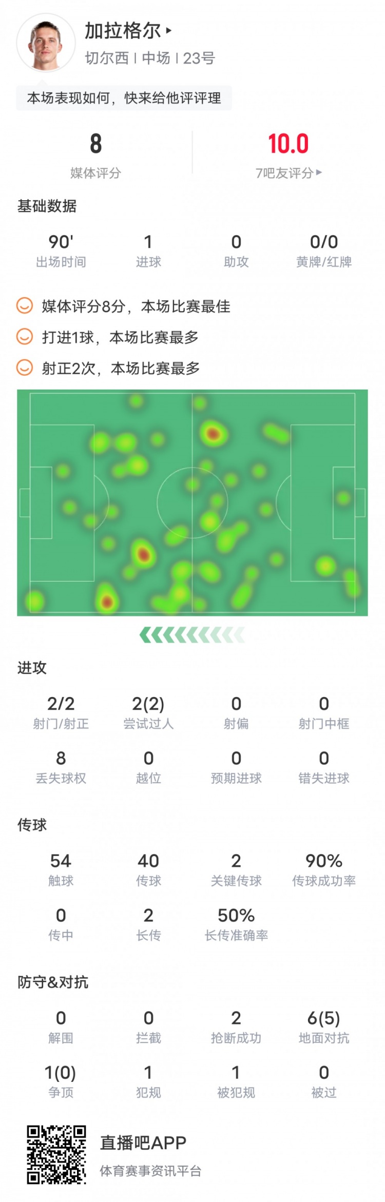 2月8日讯 足总杯第四轮重赛,切尔西3-1维拉。本场比赛,蓝军中场加拉格尔首发出战打满全场,贡献1粒进球,2次关键传球,还有2次过人成功,评分8.0。