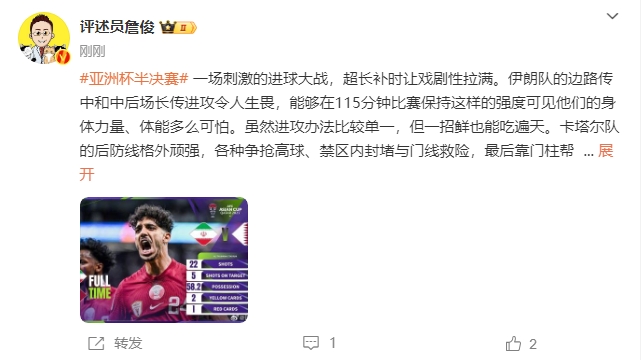 02月08日讯 亚洲杯半决赛,卡塔尔3-2逆转伊朗进决赛。赛后,詹俊发文点评。