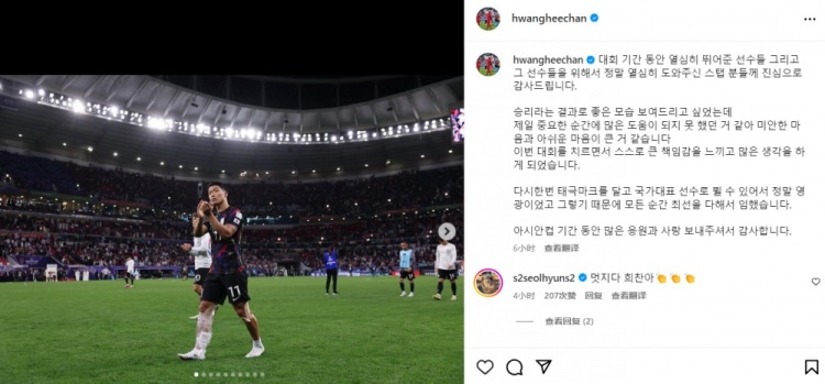 2月9日讯 韩国队本届亚洲杯止步4强,黄喜灿更新了社媒谈到了球队出局后的感受。
