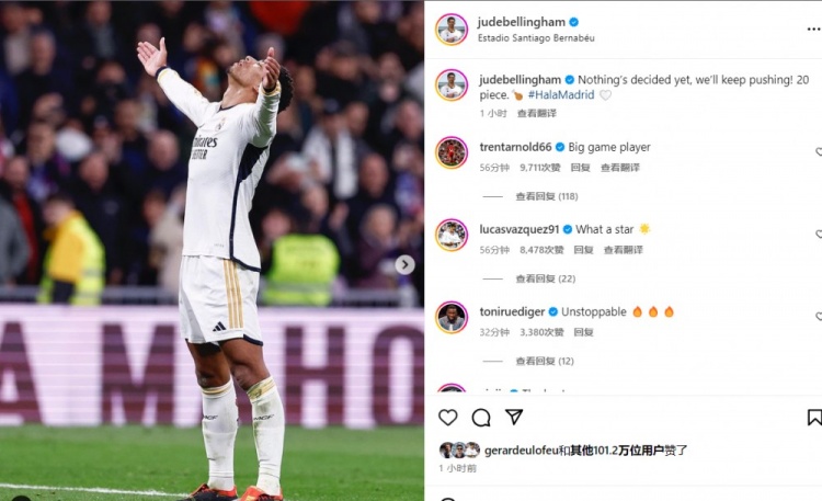 赛后贝林厄姆更新了社媒:什么还没有决定呢,我们会继续努力!打进20球?? #HalaMadrid ??。