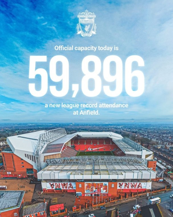 利物浦本轮英超主场对阵伯恩利,利物浦官方消息,本场比赛共有59896名球迷现场观战,创造了安菲尔德球场的联赛上座人数纪录。