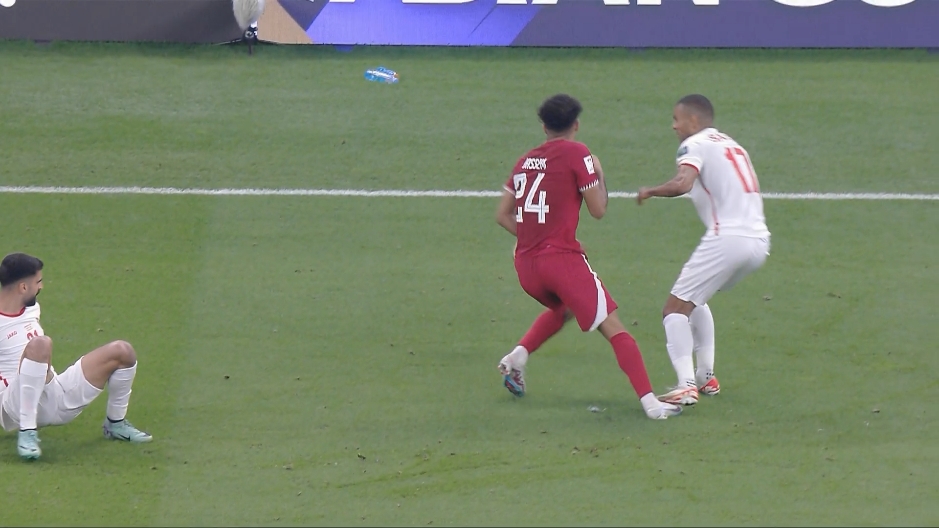 上半场补时最后时刻,约旦后卫阿贾林亮鞋钉踩踏卡塔尔中场加伯,主裁判马宁果断向阿贾林出示黄牌警告。