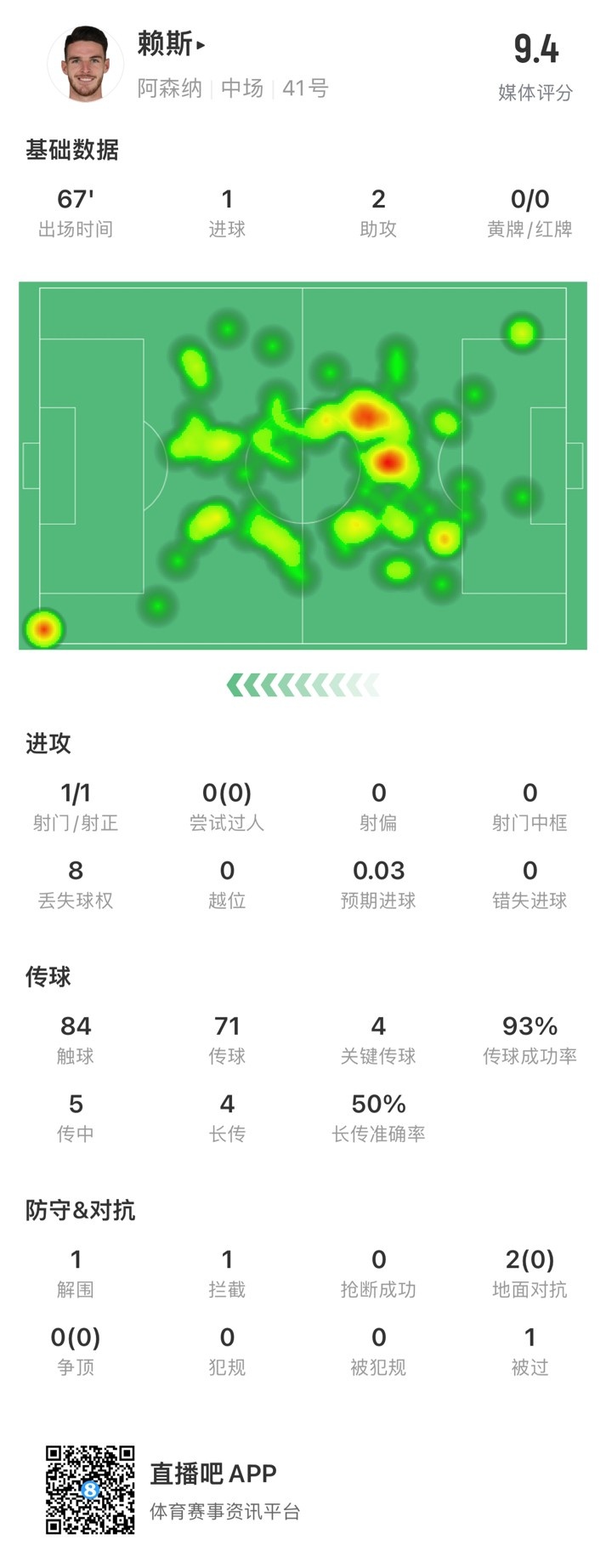 2月11日讯 阿森纳本轮客战西汉姆,赖斯面对老东家首发出战67分钟,贡献1射2传,赛后获评9.4分。