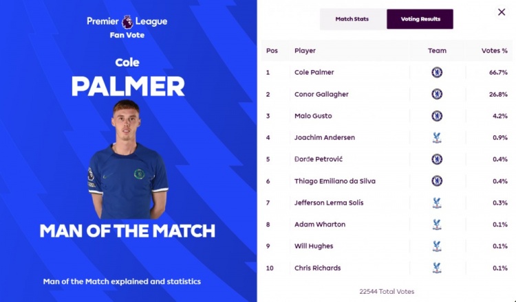 助攻双响的帕尔默以66.7%的得票率当选,进球双响的加拉格尔得票率26.8%排在第二。