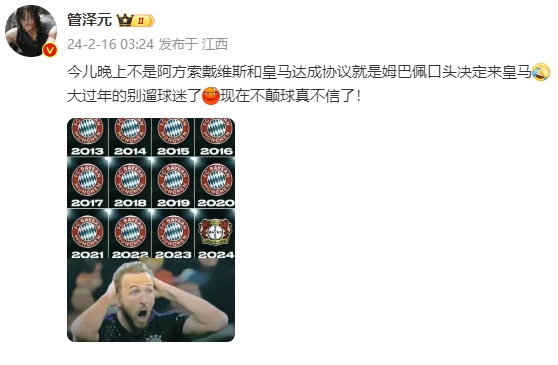 对于姆巴佩和戴维斯与皇马的传闻,管泽元发文:“今儿晚上不是阿方索戴维斯和皇马达成协议就是姆巴佩口头决定来皇马,大过年的别遛球迷了??现在不颠球真不信了!”