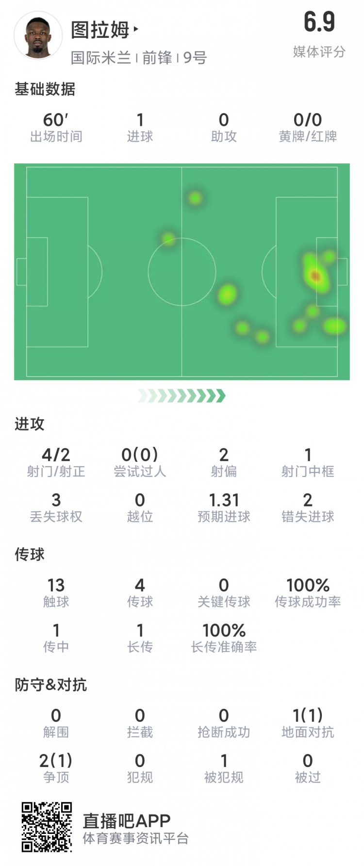 2月17日讯 在本轮意甲国米对阵萨勒尼塔纳的比赛中,小图拉姆打进一球,以下为他在本场具体数据: