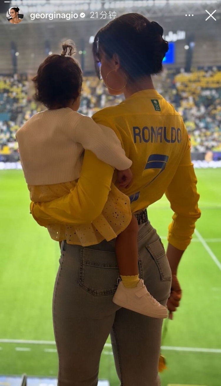 比赛中,C罗女友乔治娜更新了动态,她抱着小女儿贝拉,一起来到了现场观战C罗的比赛。