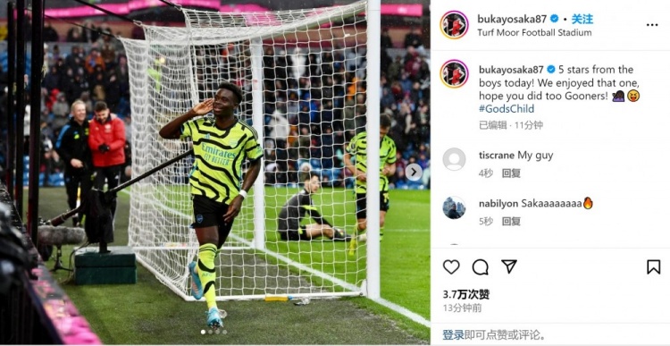 萨卡晒出自己庆祝进球时的照片,并写道:“给今天男孩们的表现打五颗星!我们很享受这场胜利,希望你们也是如此,枪迷们??????。”