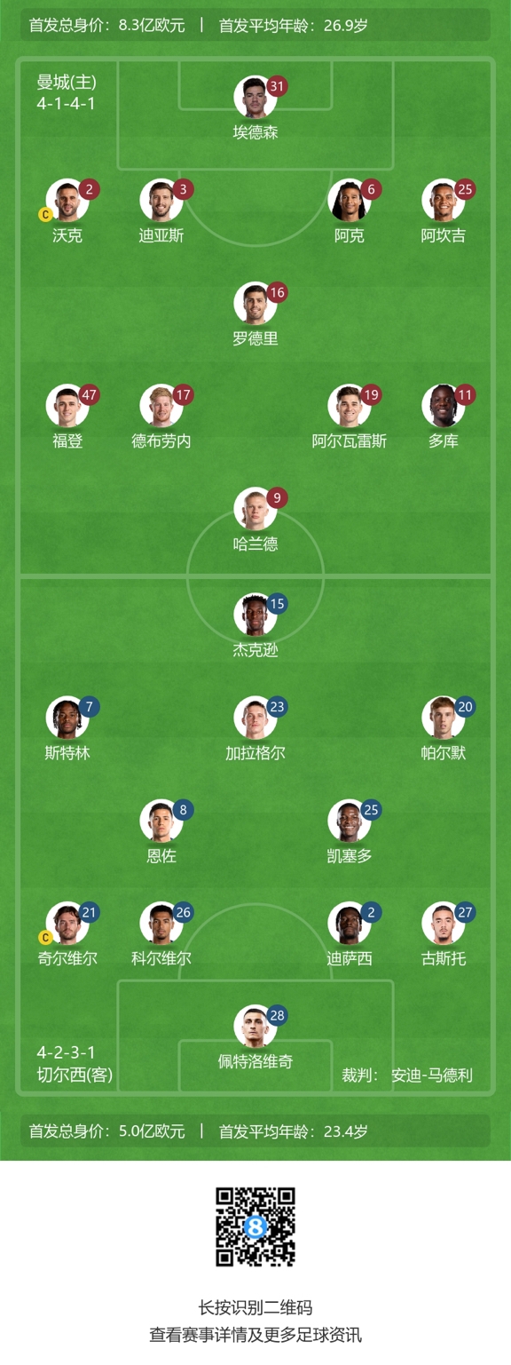 曼城首发:31-埃德森、2-沃克、3-迪亚斯、25-阿坎吉、6-阿克、16-罗德里、19-阿尔瓦雷斯、17-德布劳内、47、福登、11-多库、9-哈兰德