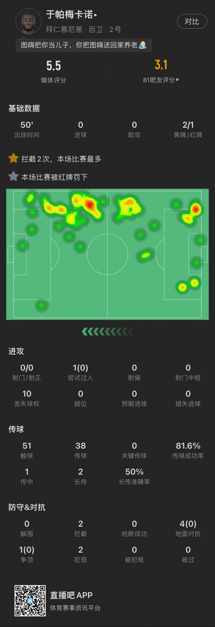 2月19日讯 在刚刚结束的德甲第22轮比赛中,拜仁客场2-3不敌波鸿,遭遇各项赛事三连败。本场比赛,于帕梅卡诺灾难级发挥,替补登场50分钟两黄变一红被罚下场,Sofascore评分5.5全场最低。