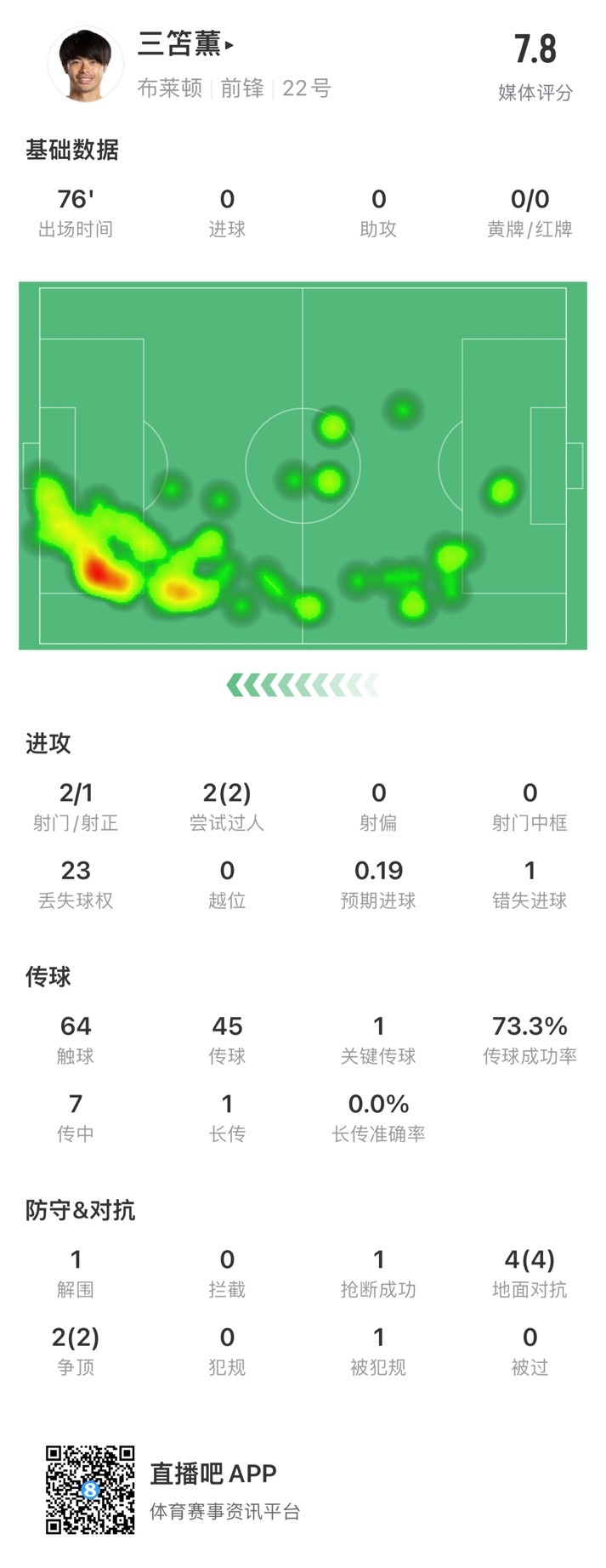 2月19日讯 布莱顿本轮5-0大胜谢菲联,日本国脚三笘薰首发出战76分钟,他制造对手红牌并制造一粒乌龙,赛后获评7.8分。