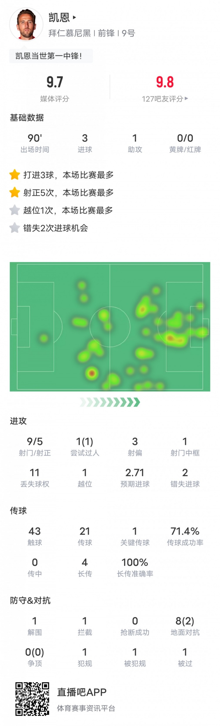 3月10日讯 在拜仁8-1美因茨的比赛中,凯恩首发出战,贡献3射1传,1次射中门框,还有2次错失进球机会,评分9.7全场第二高。