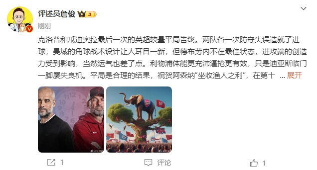 詹俊:克洛普和瓜迪奥拉最后一次的英超较量平局告终。两队各一次防守失误造就了进球,曼城的角球战术设计让人耳目一新,但德布劳内不在最佳状态,进攻端的创造力受到影响,当然运气也差了点。利物浦体能更充沛逼抢更有效,只是迪亚斯临门一脚屡失良机。平局是合理的结果,祝贺阿森纳“坐收渔人之利”,在第十六轮后再次登顶!!月底枪手将客战曼城!
