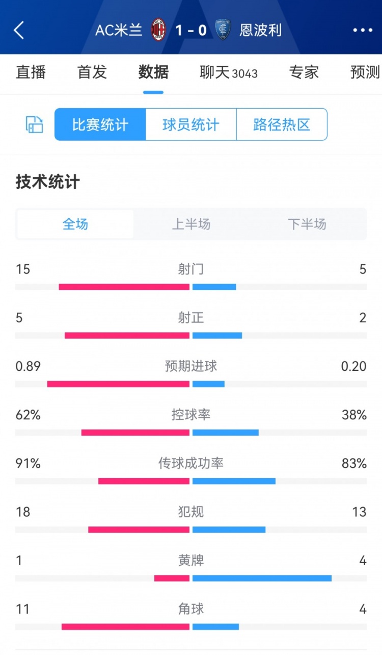 3月11日讯 本轮意甲米兰1-0恩波利暂升第二,双方全场数据对比如下↓