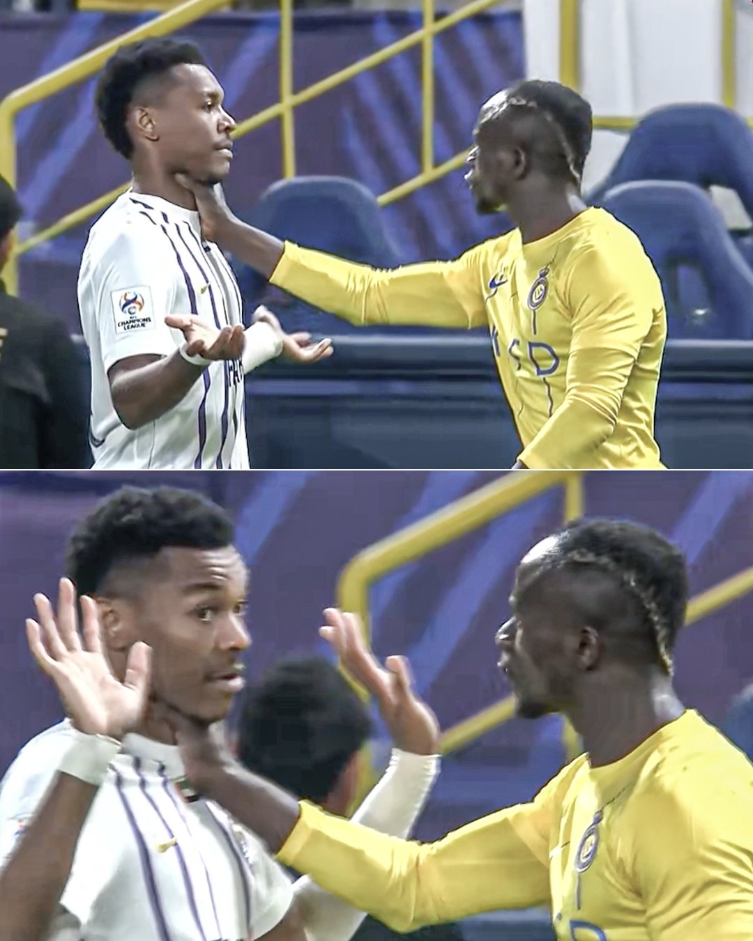 03月12日讯 亚冠1/4决赛次回合,利雅得胜利主场对阵阿尔艾因。第71分钟,马内与对方球员互喷了几句,随后上手掐住了对手的脖子,最终马内因锁喉动作吃到黄牌。