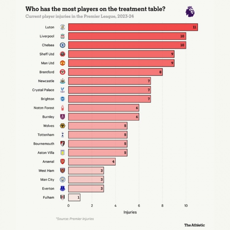 3月12日讯 The Athletic统计了英超各队当前伤病人数,卢顿11人居首,利物浦和切尔西各有10人养伤,曼联9人受伤。