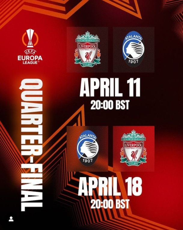 3月15日,本赛季欧联1/4决赛抽签结果出炉,利物浦面对意甲球队亚特兰大,其余3组对决为米兰vs罗马、勒沃库森vs西汉姆以及本菲卡vs马赛。