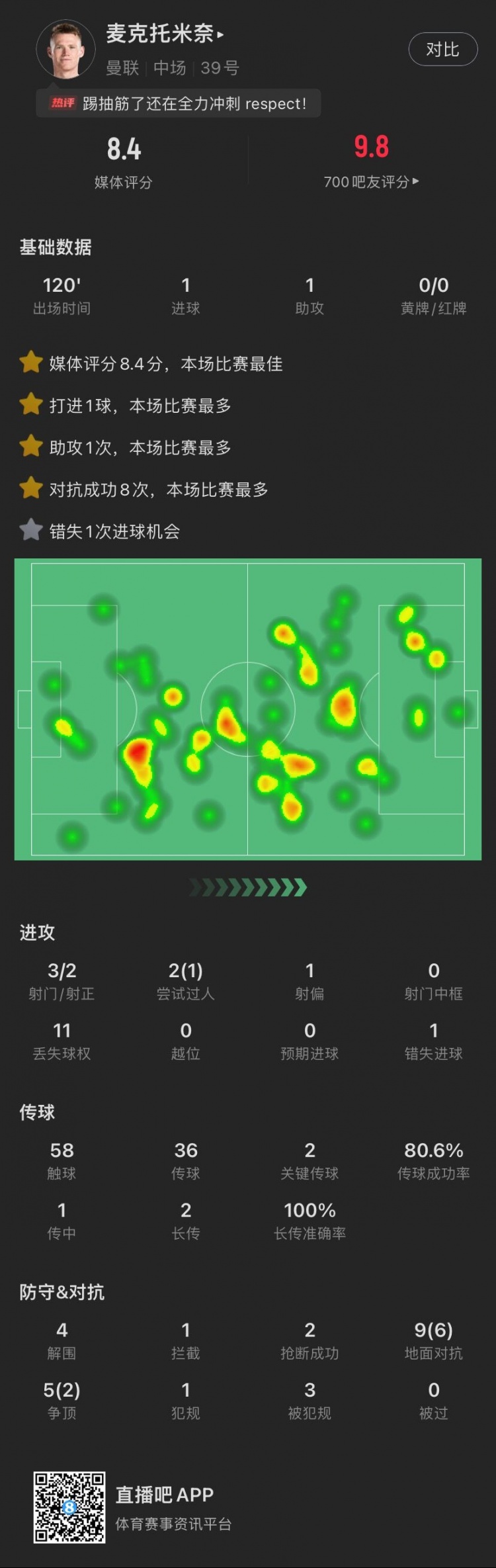 3月18日讯 足总杯1/4决赛全部落幕,曼联4-3绝杀利物浦,晋级4强。本场比赛,小麦打满120分钟,攻防两端均发挥出色,贡献1传1射,获评8.4分全场最高。