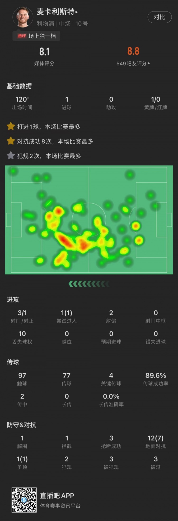 3月18日讯 足总杯1/4决赛,曼联4-3战胜利物浦。麦卡利斯特全场数据: