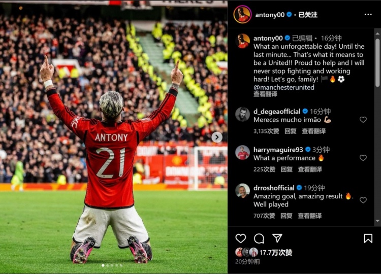 安东尼晒出自己庆祝进球时的照片,并写道:多么令人难忘的一天!坚持到最后一刻...这就是为曼联效力的意义!!很骄傲我能帮上忙,我永远不会停止战斗,永远不会停止努力训练!家人们,我们加油!