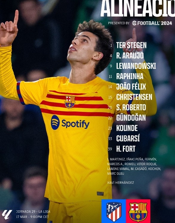 巴萨首发:1-特尔施特根、23-孔德、4-阿劳霍、33-库巴西、39-赫克托-福特、16-费尔明、20-罗贝托、22-京多安、9-莱万、11-拉菲尼亚、14-菲利克斯