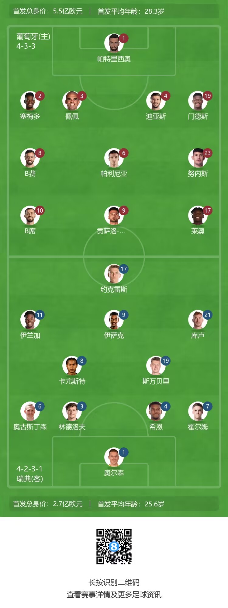 葡萄牙首发:1-帕特里西奥、2-塞梅多、3-佩佩、4-鲁本-迪亚斯、19-努诺-门德斯、6-帕利尼亚、8-B费、23-努内斯、10-B席、9-贡萨洛-拉莫斯、17-莱奥