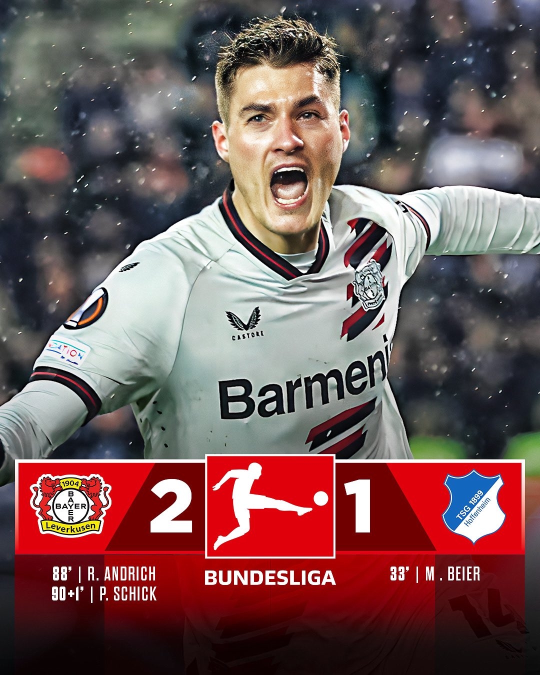 03月30日讯 德甲第27轮,勒沃库森主场2-1逆转绝杀霍芬海姆,药厂最后时刻3分钟2球翻盘。