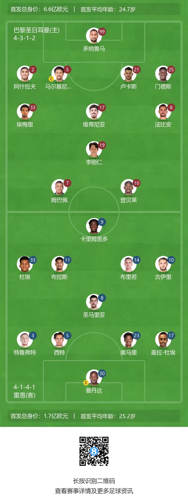 巴黎首发:99-多纳鲁马、2-阿什拉夫、5-马尔基尼奥斯、21-卢卡斯-埃尔南德斯、25-努诺-门德斯、33-扎伊尔-埃梅里、8-法比安、17-维蒂尼亚、19-李刚仁、10-登贝莱、7-姆巴佩