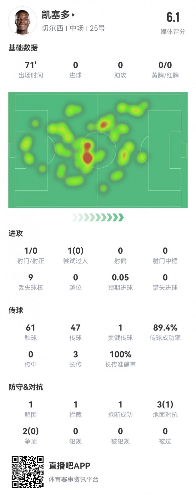 4月5日讯 本轮英超焦点战,切尔西暂2-3曼联。此役凯塞多首发出战71分钟被换下,球员全场重点数据如下↓
