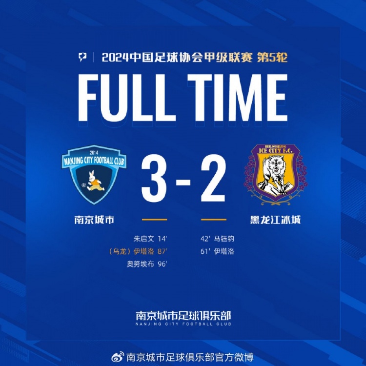 4月6日,2024中甲联赛第5轮的比赛在五台山体育场进行,最终南京城市主场3-2战胜黑龙江冰城。