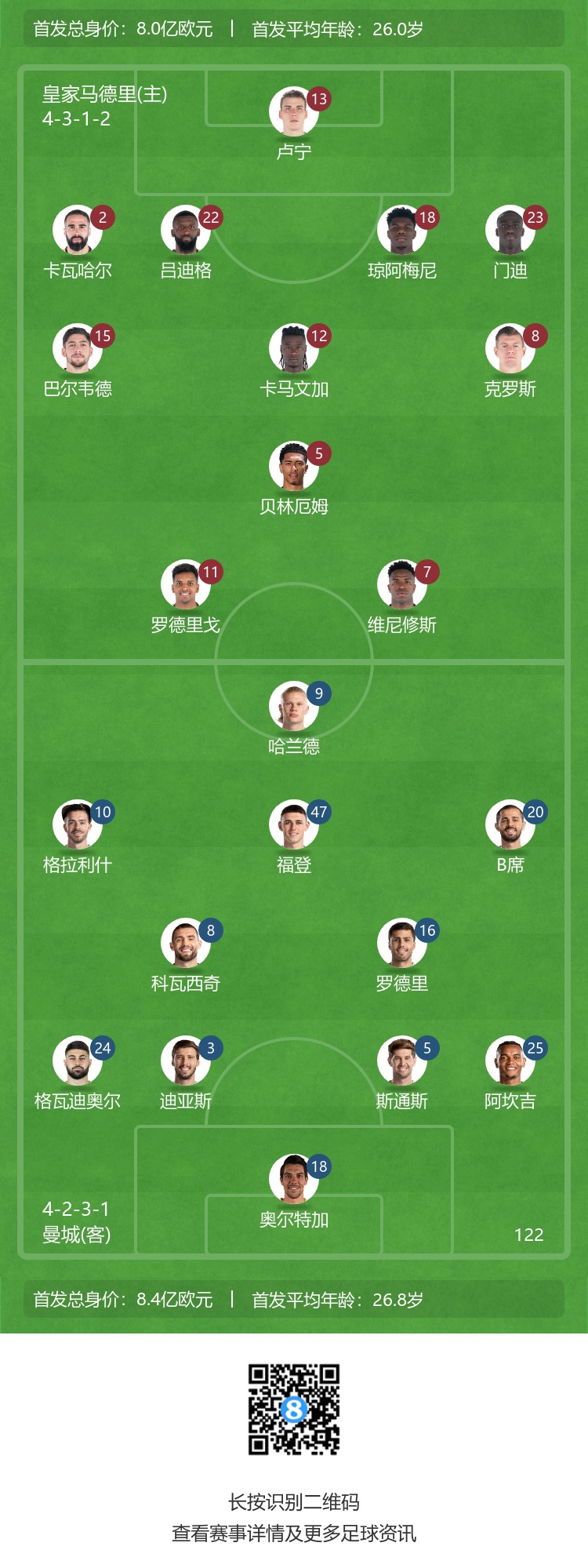 皇马首发:13-卢宁、2-卡瓦哈尔、22-吕迪格、18-琼阿梅尼、23-费兰-门迪、15-巴尔韦德、12-卡马文加、8-克罗斯、7-维尼修斯、5-贝林厄姆、11-罗德里戈