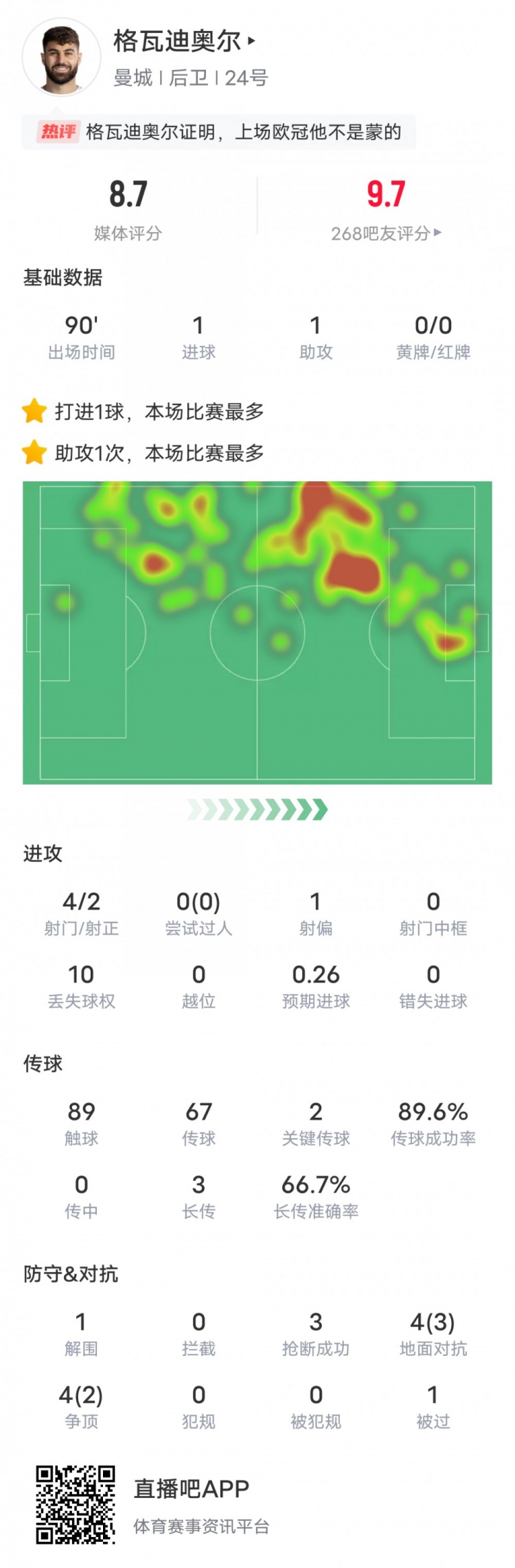 4月14日讯 在5-1战胜卢顿的比赛中,曼城后卫格瓦迪奥尔首发出战,传射建功,还送出2此关键传球和3次抢断,评分8.7。