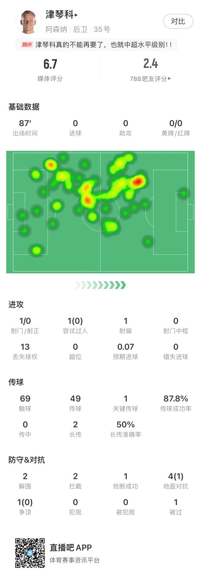 4月15日讯 阿森纳本轮0-2不敌维拉,津琴科出战87分钟,他13次丢失球权,4次对抗成功1次,获评6.7分。
