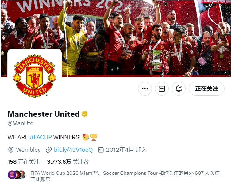 05月26日讯 足总杯决赛,曼联击败曼城夺冠。赛后,曼联官推更改了账号简介,内容是:我们是足总杯冠军!