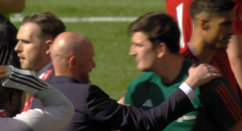 将相和!滕哈赫与本场缺阵的马奎尔拥抱+开心交流