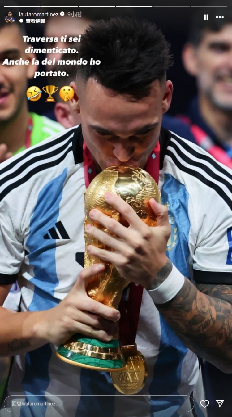 随后劳塔罗在个人社媒发帖回击,他亲吻世界杯奖杯,写道:“特拉维萨(劳塔罗把名字打错)你忘了,世界杯我也带来了”。同时还配上了三个表情:??????