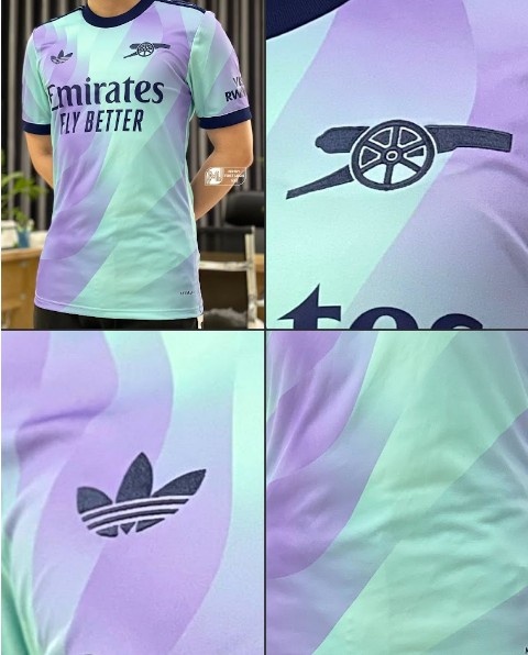 这款球衣以水绿色为主色调,搭配浅紫色和海军蓝。此外,这将是自1992年以来,阿迪达斯的三叶草标志再次出现在了阿森纳的球衣上。