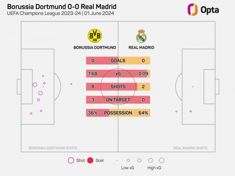 6月2日讯 欧冠决赛半场,皇马0-0多特,多特在射门数上遥遥领先!
